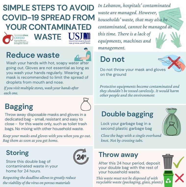 Durant cette crise sanitaire, rester à la maison est essentiel pour lutter contre le virus COVID-19, mais le tri de nos déchets est tout aussi important. Nos gants et masques peuvent être contaminés et il est de notre devoir de nous en débarrasser correctement. Voici quelques étapes simples sur la façon d'éliminer nos déchets contaminés de manière à lutter contre le virus.