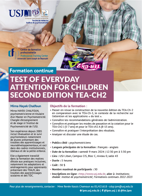 • Passer en revue la construction de la nouvelle édition du TEA-Ch-2 en comparaison avec le TEA-Ch-1, le contexte de la recherche sur l’attention et les applications « du test ».