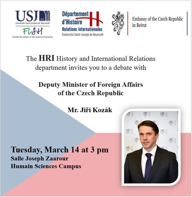 En collaboration avec l'ambassade de la République tchèque au Liban, le département d’Histoire-Relations internationales de la Faculté des lettres et des sciences humaines a le plaisir de recevoir le Vice-ministre aux Affaires Etrangères de la République tchèque, le mardi 14 mars à 15h.