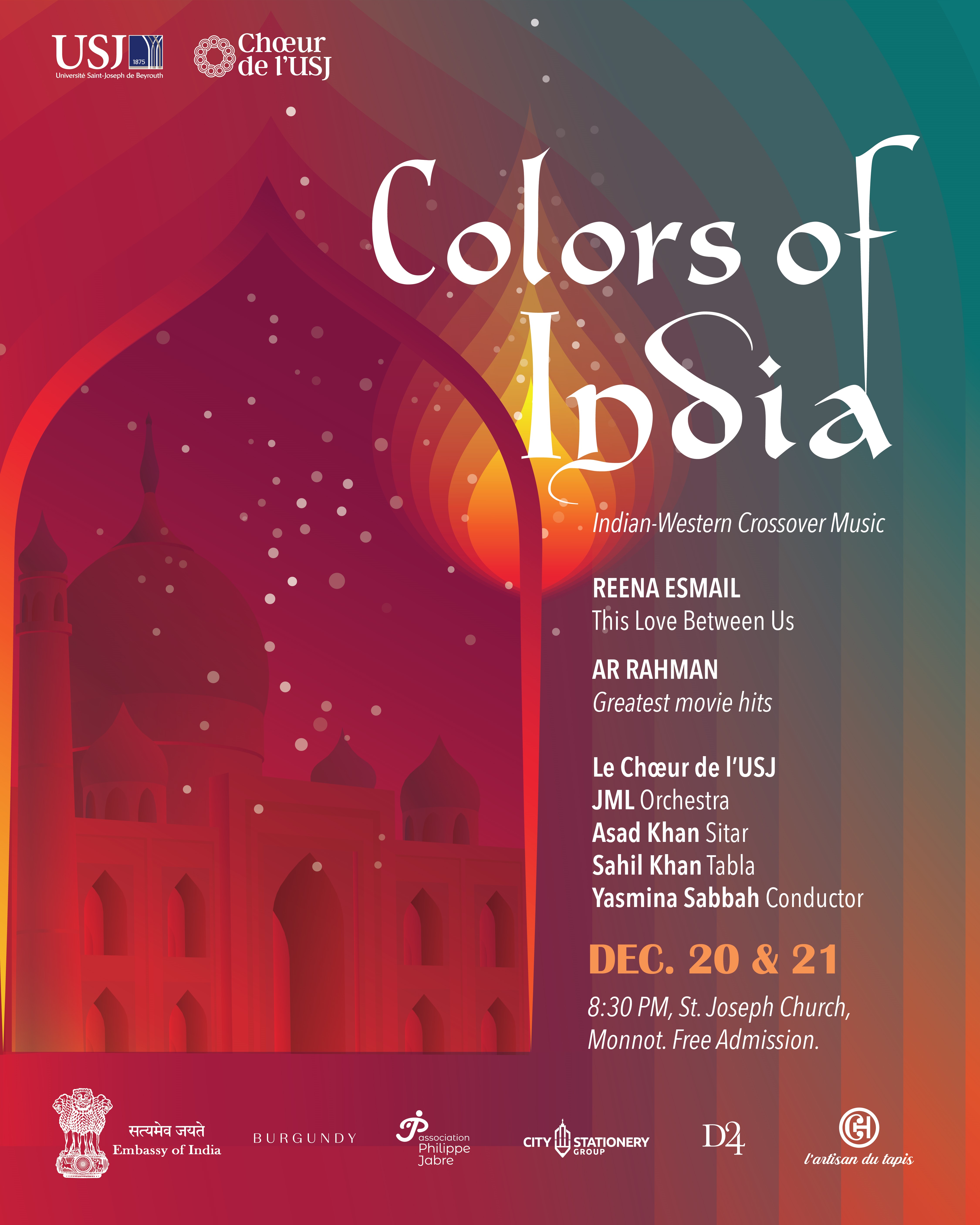 Join us on Wednesday, December 20, and Thursday, December 21, 2023, as the USJ Choir takes center stage in the vibrant and culturally rich performance, Colors of India, under the expert baton of conductor Yasmina Sabbah. The concert will feature “This Love Between Us” by Reena Esmail, as well as film hits by Oscar-winning composer, A.R. Rahman.