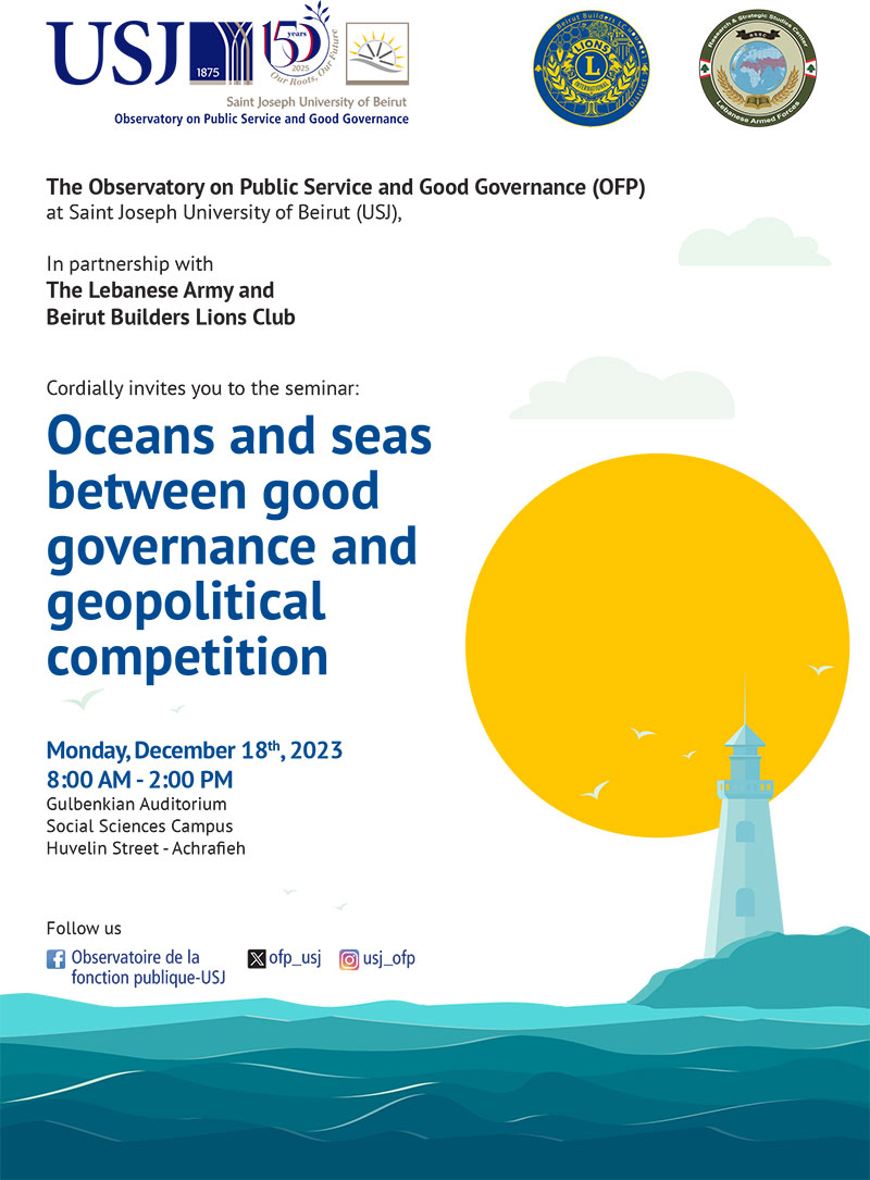 L'Observatoire de la fonction publique et la bonne gouvernance (OFP) de l'Université Saint-Joseph de Beyrouth (USJ), en partenariat avec l'Armée Libanaise et le Beirut Builders Lions Club, a le plaisir de vous inviter au séminaire intitulé "Océans et mers : entre bonne gouvernance et compétition géopolitique". Cette rencontre se tiendra le lundi 18 décembre 2023, de 9h00 à 14h00, à l'Auditorium Gulbenkian du Campus des sciences Sociales, de la rue Huvelin à Achrafieh.