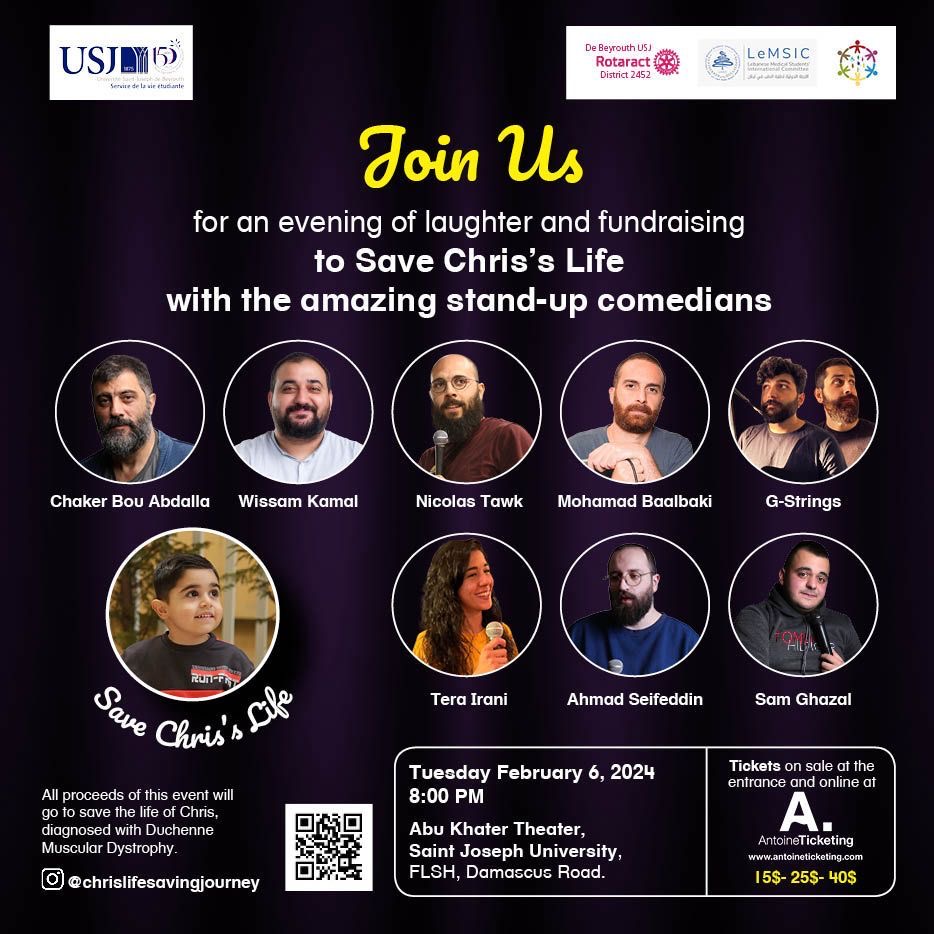 Le Service de la vie étudiante, en collaboration avec Rotaract de Beyrouth USJ, Lebanese Medical Students' International Committee (LeMSIC) et le Club Inclusion de l'USJ, vous invite à une soirée de stand-up comédie exceptionnelle en soutien à Chris, un jeune héros touché par la dystrophie musculaire de Duchenne.