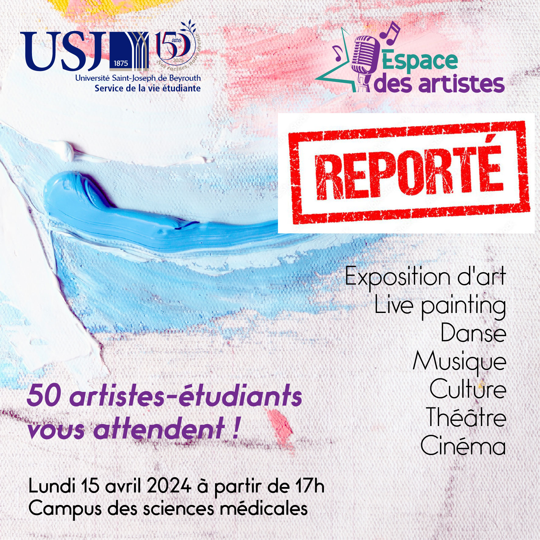 Rejoignez-nous le lundi 15 avril 2024, à partir de 17h, au Campus des sciences médicales (CSM), pour assister à une soirée animée de talents et de passion. Découvrez des chanteurs, des musiciens, des réalisateurs, des acteurs, des danseurs, des peintres et d'autres artistes parmi des visages qui vous sont familiers.