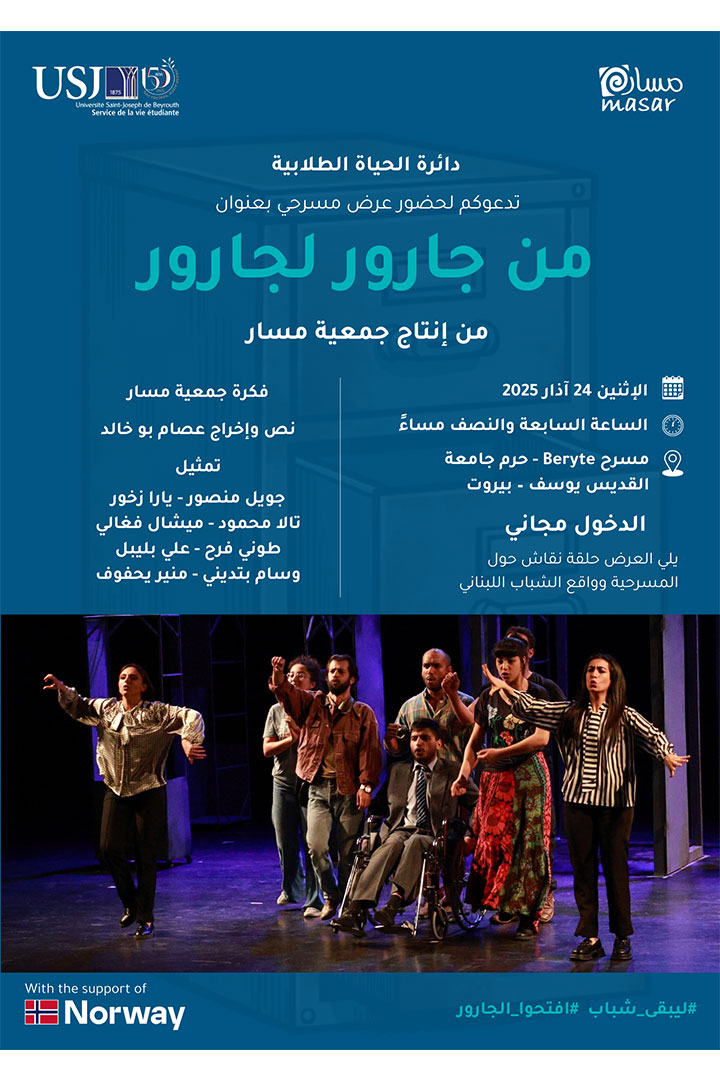 تنظّم جمعية مسار بالتعاون مع مكتب الحياة الطلابية في جامعة القديس يوسف عرضًا مسرحيًا يُسلّط الضوء على التحديات التي يواجهها الشباب اللبناني، ويؤكّد على أهمية تنفيذ السياسة الوطنية للشباب التي أقرّها مجلس الوزراء في العام 2012 وخطة العمل المرتبطة بها لعام 2022.