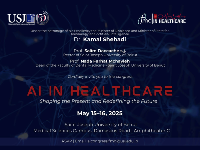 Under the Patronage of his Excellence the Minister of Displaced and Minister of State for Technology and Artificial Intelligence Dr. Kamal Shehadi, Pr Salim Daccache, rector of Saint-Joseph University of Beirut and Prof. Nada Mchayleh Farhat, Dean of the Faculty of Dental Medicine at Saint-Joseph University of Beirut, Cordially announce the congress: AI in healthcare: Shaping the present and redefining the future.