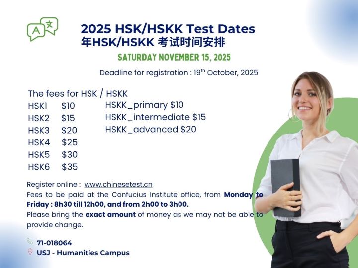 Fees for the test are paid at the office of Confucius Institute, USJ.