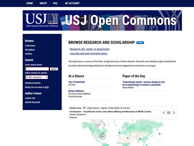 Une carte interactive, accessible depuis la page d’accueil, illustre en temps réel la portée mondiale de la recherche de l’USJ : elle affiche les pays et les villes où les articles sont consultés, soulignant la diffusion internationale des publications. Cette fonctionnalité permet de visualiser l’impact global de la production scientifique de l’université, des États-Unis à l’Europe et du Moyen-Orient jusqu’à l’Asie.
