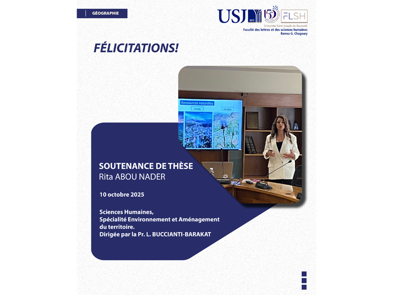 Le 10 octobre 2025, Mlle Rita ABOU NADER a soutenu sa thèse en Sciences Humaines, Spécialité Environnement et Aménagement du territoire, dirigée par la Pr. L. BUCCIANTI-BARAKAT. Sa thèse a porté sur l’implémentation d’un Parc Naturel Régional dans l’Union des Municipalités de Jezzine en partenariat avec le Parc du Verdon (Région PACA-France) et la participation des décideurs, acteurs et communauté locale.