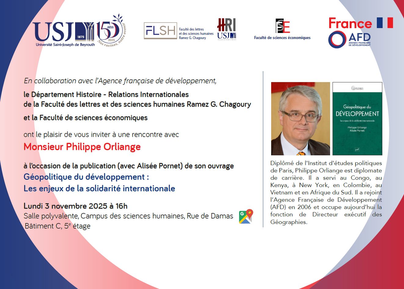 Le Département d’Histoire et Relations Internationales, en collaboration avec la Faculté des sciences économiques et l’Agence Française de Développement (AFD), a le plaisir de vous inviter à une conférence-débat avec Monsieur Philippe Orliange, diplomate et Directeur exécutif des Géographies à l’AFD.