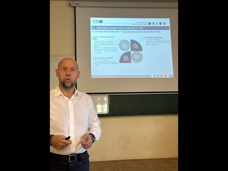 Dans le cadre du programme Lebanon Innovate, financé par l’Union européenne et coordonné par Berytech, une réunion consacrée aux thématiques de la propriété intellectuelle et du transfert de technologie des résultats de recherche s’est tenue le lundi 29 septembre 2025. Organisée en collaboration entre le Vice-rectorat à la recherche (VRR) et le Centre de formation professionnelle (CFP) de l’Université Saint-Joseph de Beyrouth (USJ) dirigé par M. Fadi El Hage, cette rencontre, animée par le Professeur Richard Maroun, Vice-recteur à la recherche, et Zeina Hobeika, Professeur adjoint et membre du Bureau du transfert de technologie, a permis de présenter, d’une part, la situation actuelle de la recherche à l’USJ, ses défis, ses besoins ainsi que le plan triennal du VRR dans ce domaine, et d’autre part, le programme Lebanon Innovate, ses opportunités et le futur programme de formation proposé aux chercheurs.