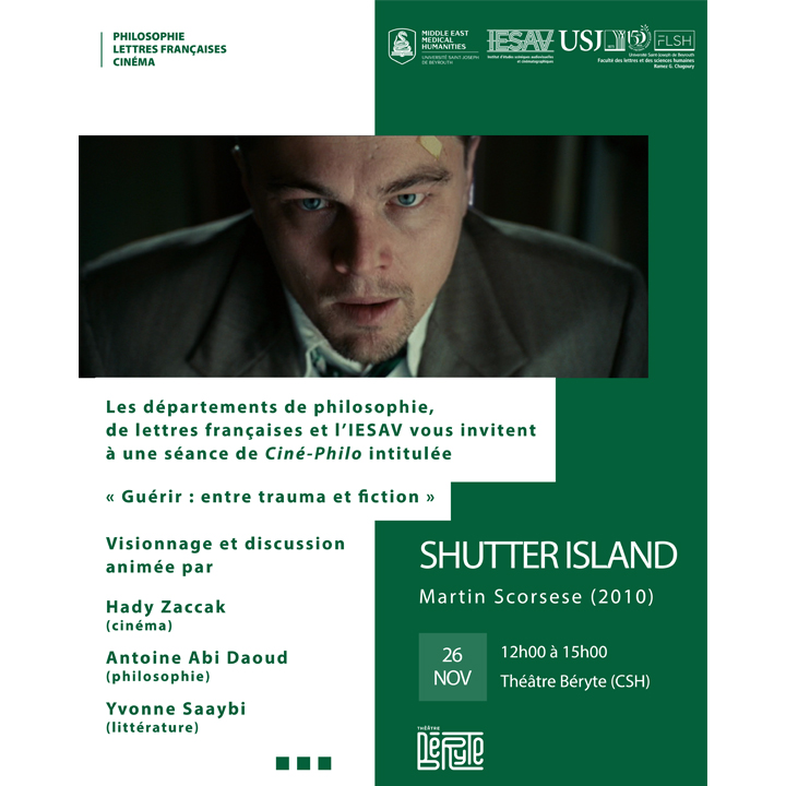 Les départements de philosophie, de lettres françaises et l’IESAV ont le plaisir de vous inviter à une séance de « Ciné-Philo » sur le thème de l’aliénation et de l’expérience asilaire : « Guérir : entre trauma et fiction », le mercredi 26 novembre 2025, de 12h00 à 15h00, au Théâtre Béryte (Campus des Sciences Humaines).