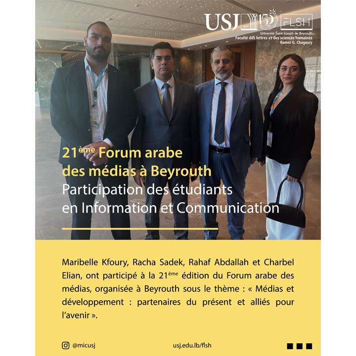 Les étudiants du Master en Information et Communication de la Faculté des lettres et des sciences humaines Ramez, G. Chagoury (FLSH), Maribelle Kfoury, Racha Sadek, Rahaf Abdallah et Charbel Elian, ont participé à la 21ᵉ édition du Forum arabe des médias, organisée à Beyrouth sous le thème : « Médias et développement : partenaires du présent et alliés pour l’avenir ».
