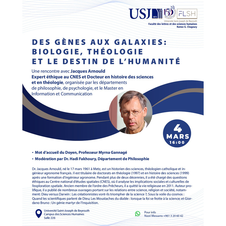 La Faculté des Lettres et des Sciences Humaines, Ramez G. Chagoury, vous invite à une rencontre exceptionnelle avec Dr. Jacques Arnould, expert éthique au CNES et docteur en histoire des sciences et en théologie. Une discussion au croisement de la science, de la foi et des grandes questions contemporaines sur l’avenir de l’humanité.