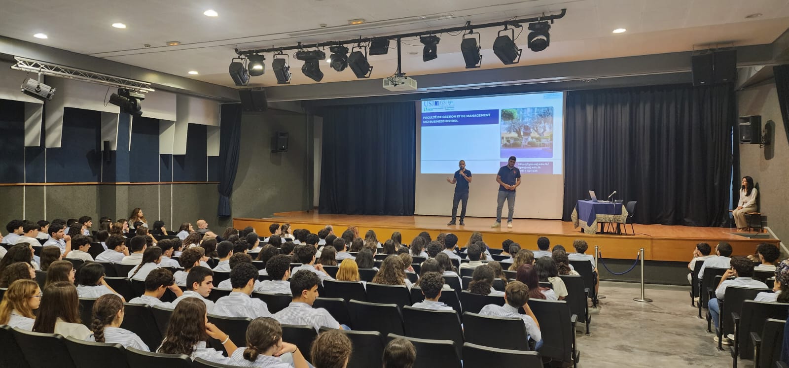 Par la suite, notre collègue Dr. Joanna Darwish a présenté la Faculté de Gestion et de Management, les programmes en cours, les doubles diplômes, les relations internationales, les accords avec les entreprises, tout en clôturant et insistant sur notre accréditation AACSB, nous plaçant parmi les meilleures 6 % business schools au monde, ainsi que sur notre taux d’employabilité de 96 % après obtention du diplôme.
