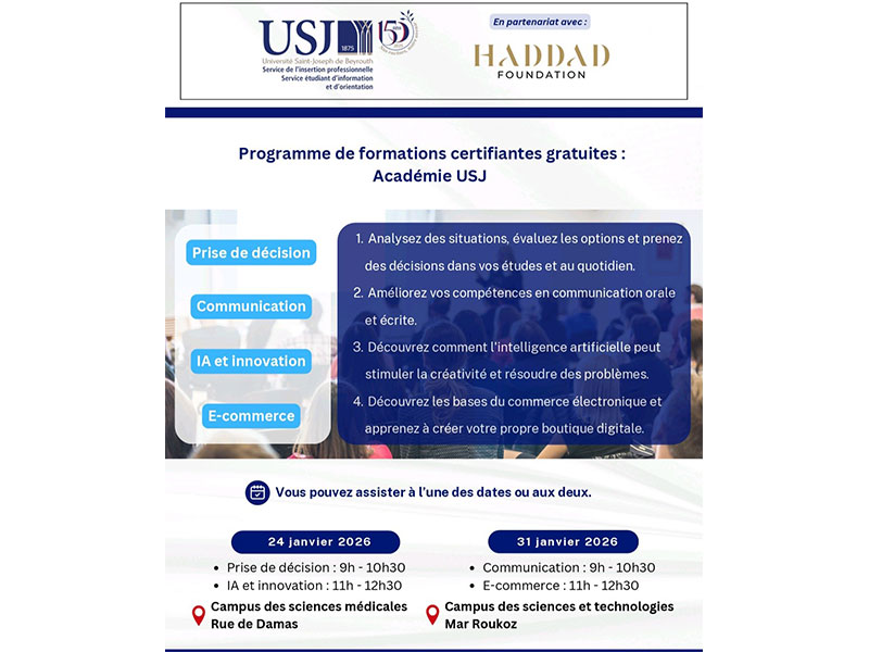 Fidèle à sa mission éducative et à son engagement envers la jeunesse libanaise, l’Université Saint-Joseph de Beyrouth a une nouvelle fois affirmé son rôle moteur dans la formation des générations futures. À travers le programme de formations certifiantes gratuites « Académie USJ », l’université a offert, en janvier 2026, une série de formations certifiantes gratuites destinées aux bénéficiaires de la Bourse Magis Spéciale Recteur.