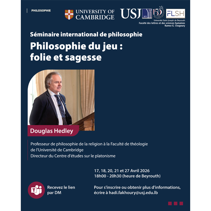 Le département de philosophie de la faculté des lettres et des sciences humaines, Ramez G. Chagoury organise en collaboration avec l’Université de Cambridge (Angleterre), un séminaire international intitulé : « Philosophie du jeu : folie et sagesse » animé par le professeur Douglas Hedley.