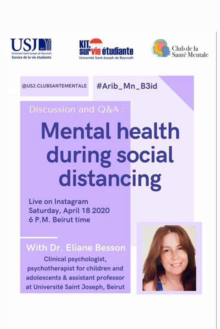 Le Club de la Santé Mentale - USJ organise une rencontre en direct sur la story de la page Instagram de la Faculté des lettres et des sciences humaines (FLSH) avec Dr Eliane Besson le samedi 18 avril 2020 à 18h pour discuter le "Mental health during social distancing".